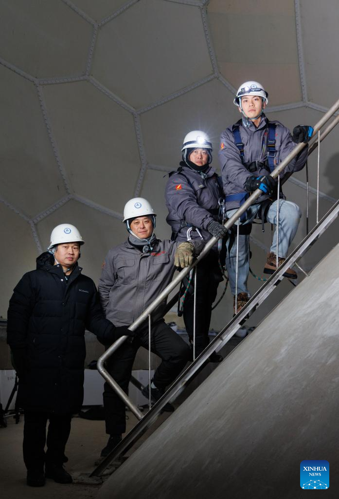 Shi Shengpu, director of the Mohe Station of China Remote Sensing Satellite Ground Station (2nd L), Engineer Gao Jingfei (1st L), Engineer Li Qiang (3rd L) and Assistant Engineer Tian Dong pose for a photo inside the antenna radome at the Mohe Station of the China Remote Sensing Satellite Ground Station in Mohe, northeast China's Heilongjiang Province, on Jan. 24, 2026. (Xinhua/Jin Liwang)