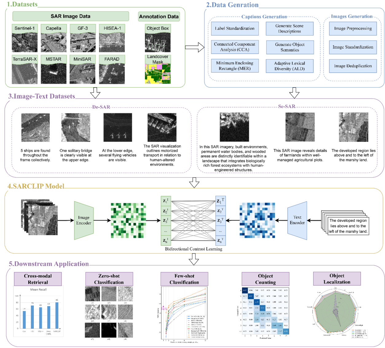 To address these limitations, the research team proposed SARCLIP, a multimodal contrastive language-image pre-training framework tailored to the physical characteristics and semantic properties of SAR data. At the core of the framework is SARCAP, a large-scale SAR image-text pre-training dataset comprising more than 400,000 image-text pairs across multiple resolutions, sensors, and scene types. Based on SARCAP, SARCLIP jointly learns representations of SAR signals and natural language, enabling robust semantic understanding and cross-modal reasoning.